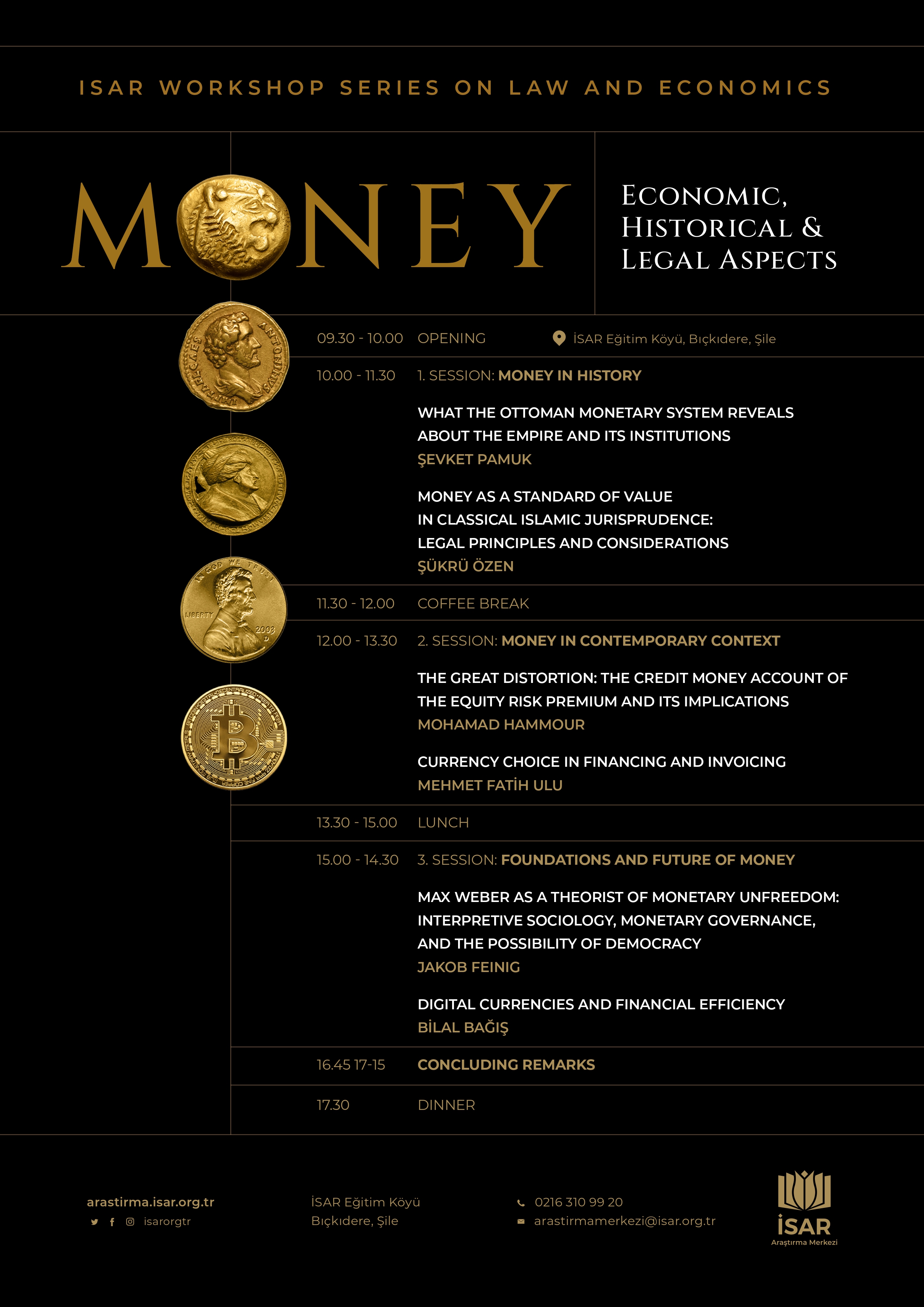Üç ana tema ekseninde şekillenecek çalıştayın ilk bölümünde, geçmiş toplumların para düzenlerini nasıl inşa ve idare ettikleri sorusundan hareketle Şevket Pamuk, Osmanlı para kurumlarının imparatorluk yapısındaki rolünü ele alacak; Şükrü Özen ise klasik İslam hukukunda paranın bir değer ölçüsü olarak kavramsallaştırılmasını inceleyecek.
