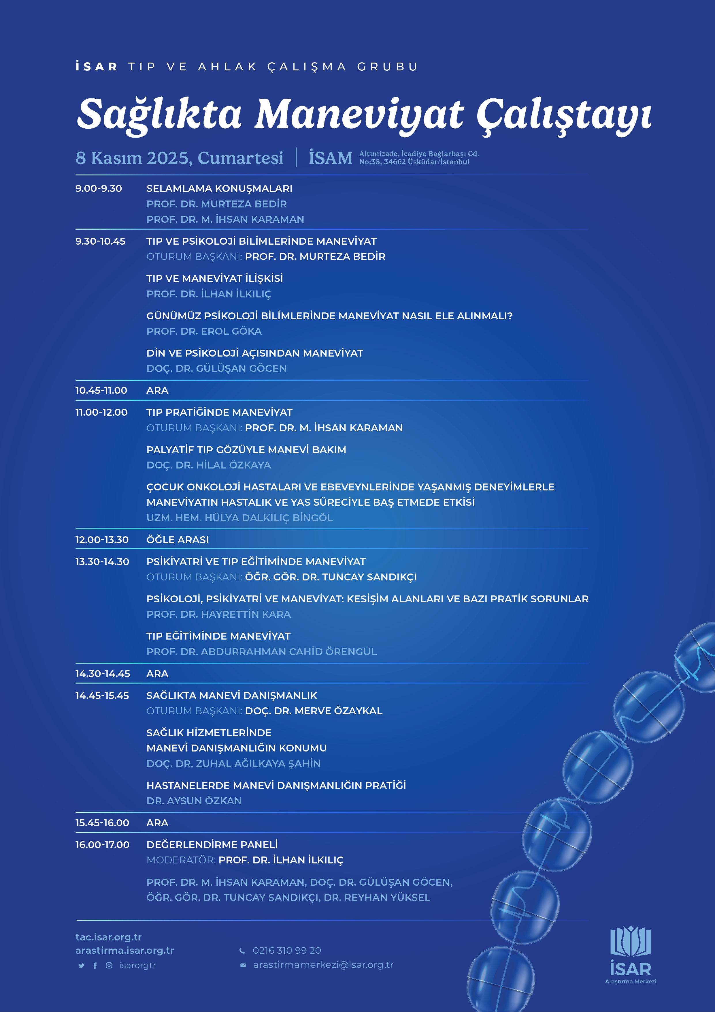 Çalıştayda tıp ve psikoloji bilimlerinde maneviyatın konumu, tıp pratiğinde manevi bakım, sağlık hizmetlerinde manevi danışmanlığın rolü ve tıp eğitiminde maneviyatın yeri gibi konular çok yönlü olarak tartışılacaktır. Program boyunca alanında yetkin akademisyen ve uzmanlar, maneviyatın modern tıbbın etik ve insani boyutlarını nasıl derinleştirebileceğine dair değerlendirmelerini paylaşacaklardır. Sağlıkta maneviyat konusuna ilgi duyan tüm araştırmacı, akademisyen ve uygulayıcılar çalıştayımıza davetlidir.